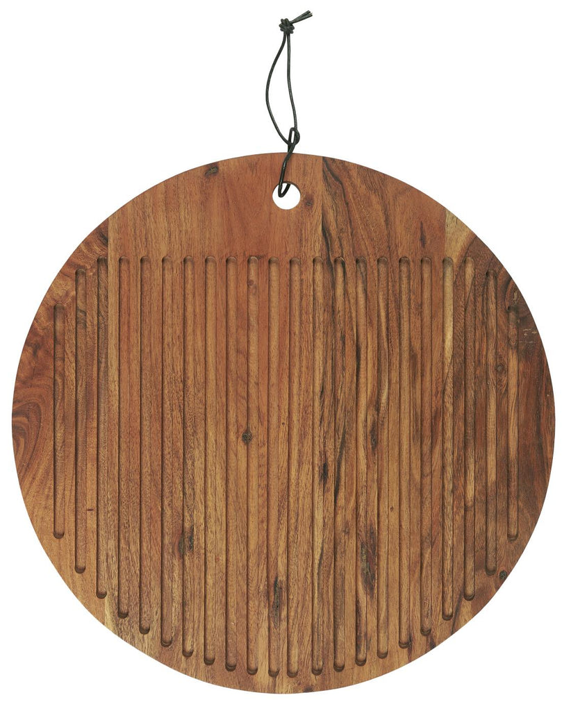 This cutting board has a rustic design made from acacia wood and finished off with a leather string.